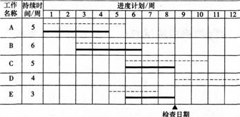 117、 某工程项目的计划进度和截止到第8周末的实际进度如下图所示(虚线表示计划进度,粗实线表示实际进度)。如果各项工作均为匀速进展,则截止到第8周末( )。