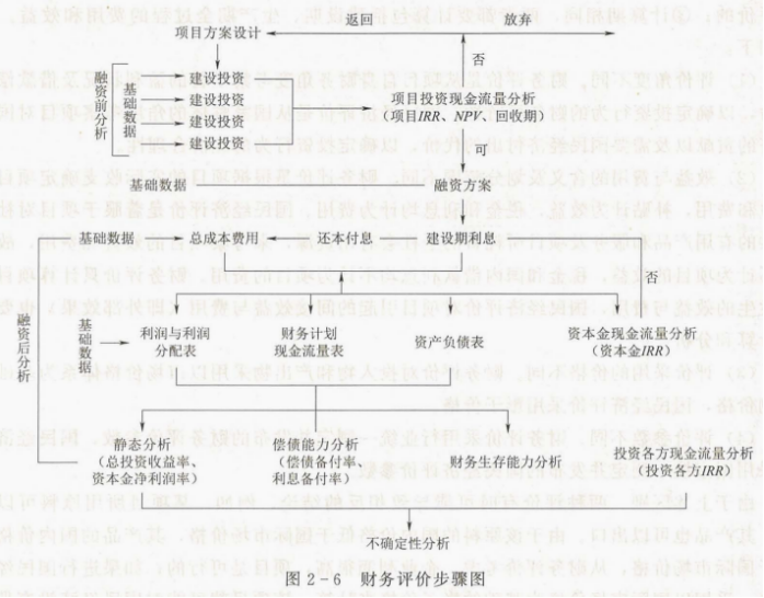 (1)财务评价一般宜先进行融资前分析,一般可分为基础数据准备、报表编制、指标计算与分析、不确定性分析及最终结论五个步骤,具体步骤如图2-6所示。