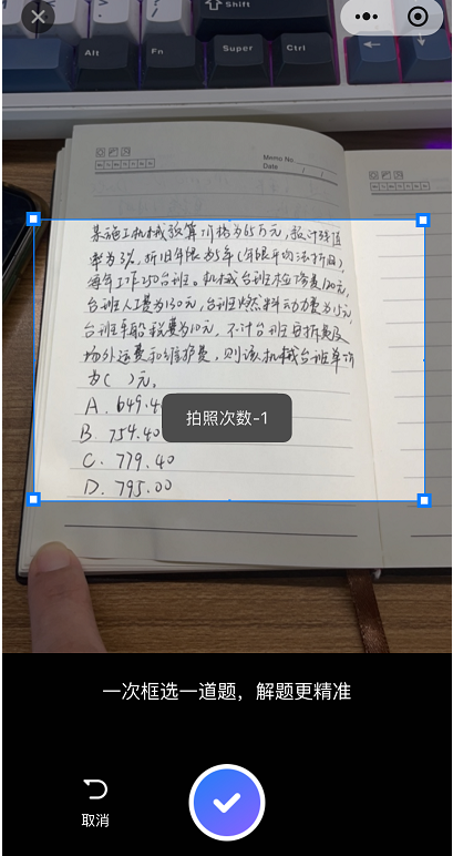 只需对准难题轻轻一拍,AI引擎将瞬间识别题目内容,并提供详细解析。这不仅仅是给你一个答案,更是带你重现将一道复杂计算题的分析、推理、计算全过程。无论是《合同管理》的工期、费用,还是《目标控制》里的网络计算,随时提问,即时解惑!