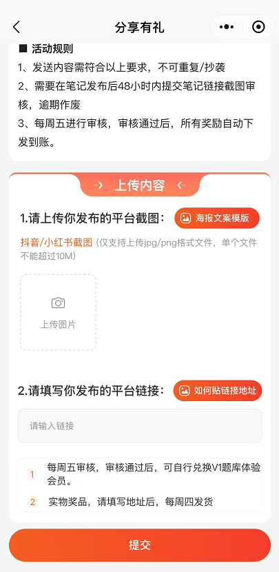 第④步,上传你发布的小红书/抖音平台截图,点击“提交”,等审核通过即可获得15天V1体验版题库会员。