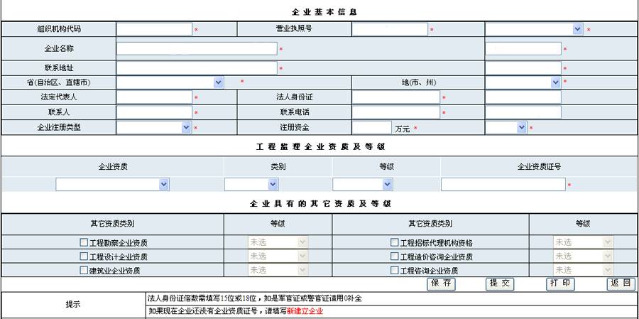 | 14.工程监理企业资质及等级 | 此处请填写您的企业所拥有的工程监理资质及等级 | 企业已有资质:类别处请选择专业,企业资质证号要完整填写。 企业还未申请资质:类别处请选择其它,请在企业资质证号上填写新设立企业。 |