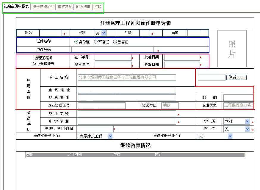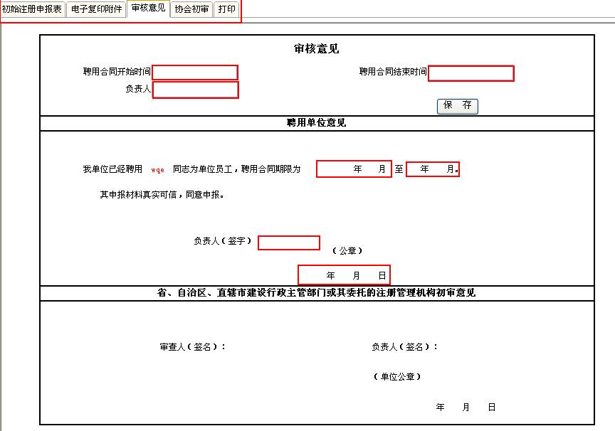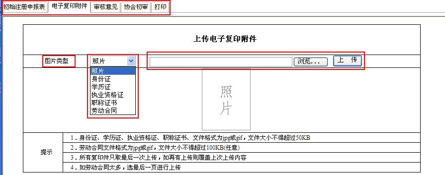 | 1.标题栏 | 如果没有完整的填写各个注册申请表,那么后面的“电子复印附件”、“审核意见”和“打印”都无法使用。 |