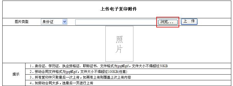 3.电子复印附件的上传过程:先点击“浏览”->选中您编辑好的照片文件,选择“打开”->点击“上传”。文件格式必须为“jpg”或者“gif”,身份证、学历证、执业资格证、职称证书的文件大小为:50KB,劳动合同的文件大小为:100KB。扫描仪扫描编辑的图片有时无法被正常的显示,这时只需要用Photoshop编辑一下,重新上传就好了。![]() ![]() ![]() 如何查看文件的大小: 方法1: 请把鼠标移动到需要的文件上,它就会自动显示文件大小。 方法2:如果没有自动地显示文件大小,那么请在文件上单击鼠标右键,选择“属性”。 ![]() 实际情况下,上图所示的地方可能会有很多项目,这里您只要选择“属性”,选择“属性”后,会出现以下的图示。图中所示的位置就是文件大小,文件大小会因为文件不同大小而不同。 ![]() 注意:身份证请上传含有照片的页面; 学历证、执业资格证、职称证书、劳动合同如有多页,请上传含有钢印的页面。 上传成功后会有这样的提示。 ![]() | |
