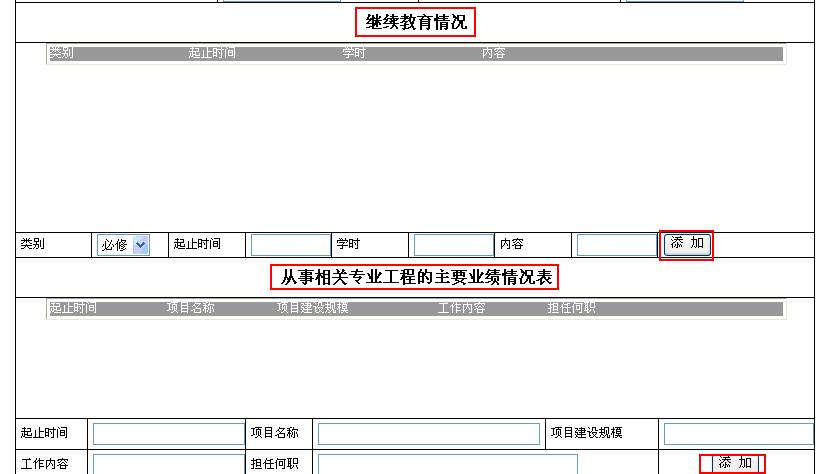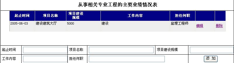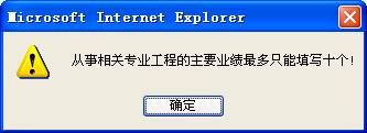 ![]() 从事相关专业工程的主要业绩情况表只能填写10个,如果超过过了10个就没法保存了。 | |