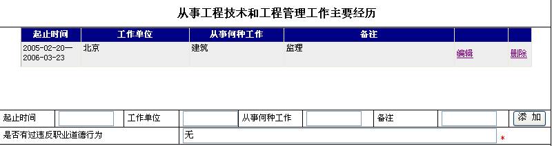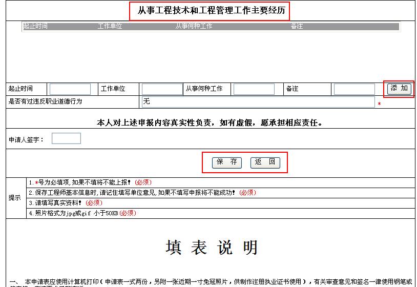 | 3.从事工程技术和工程管理工作主要经历 | 起止时间、工作单位、从事何种工作、备注中如含有数字或字母请使用半角字符填写。起止时间的格式为:年(必须输入完整年份).月.日(如果有)-年(必须输入完整年份).月.日(如果有),如:2006.5-2006.7。项目名称、项目建设规模、工作内容、担任何职等内容请保持在50字内。 |