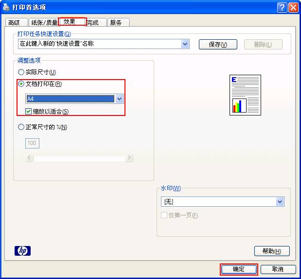 因为各品牌的打印机设置不同,请找到“效果”栏,然后调整如下选项“文档打印在->A4->缩放以合适”,记住一定要点击下方的“确定”按钮。