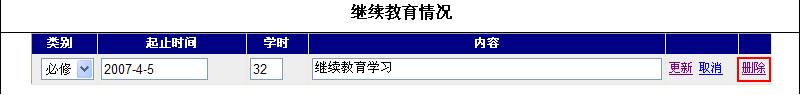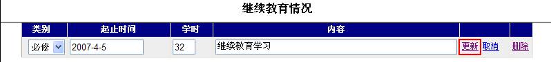 | 1.继续教育情况 | 时间、学时、内容中如含有数字或字母请使用半角字符填写。时间的格式为:年(必须输入完整年份)-月-日,如:2006-5-5。内容请保持在50字内。 |