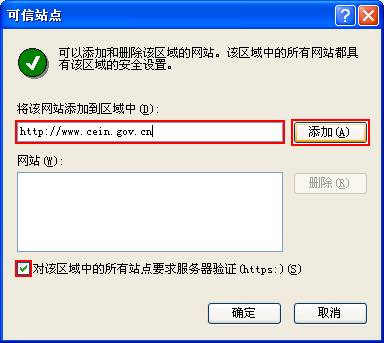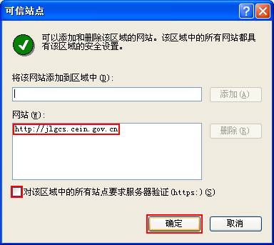 把http://jlgcs.cein.gov.cn输入到“将该网站添加到区域中(D):”下方的文字框中,点击“添加”按钮,然后请把“对该区域中的所有站点要求服务器验证(https:)(S)”前面的勾去掉。