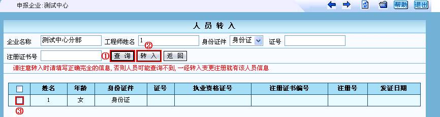 输入要到您公司的人员原聘用单位名称,和要到您公司的人员的姓名(全名),然后点击“1”进行人员的查询,如果出现该人员的信息,那么请您选中该人员信息前的方框“3”,然后点击“2”做该人员转入操作。