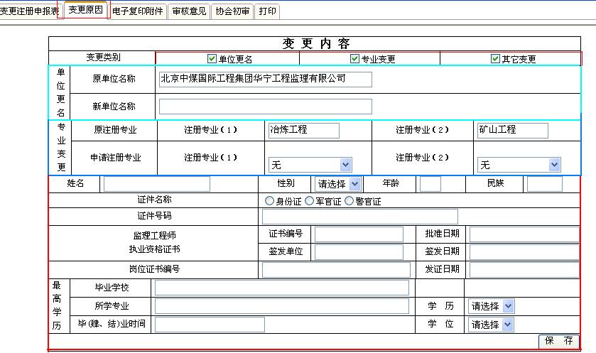 上图中变更类别是需要您选择的,点选在选择框,会出现相应的变更表格。其中专业变更下的原注册专业是变更注册申请表填写的内容,如果您需要修改专业变更下的原注册专业,只需要在申请注册专业里选择就可以,选择完点击保存。原单位名称(原聘用单位)填写汉字不要超过40个字。还有其他变更的填写,如果要做只需要进行相应的填写,然后点击保存。