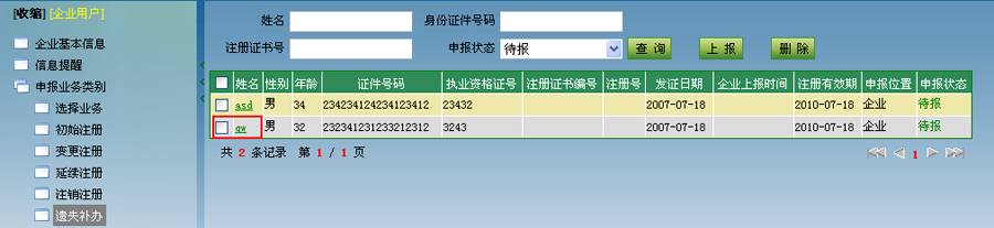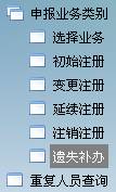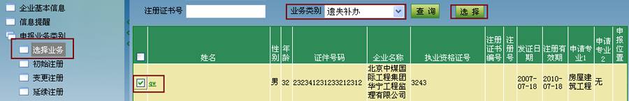 同样,要做遗失补办需要该人员已经完成了初始注册,需要在选择业务中选中该人员,然后在业务类型选择遗失补办,点击“选择”按钮。