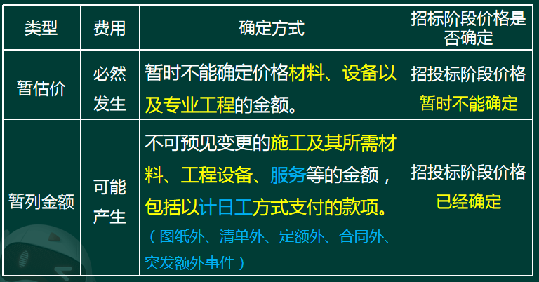 程的金额。该笔款项属于签约合同价的组成部分,合同履行阶段一定发生,但招标阶段由于局部设计深度不够、 质量标准尚未最终确定、投标时市场价格差异较大等原因,要求承包人按暂估价格报价部分,合同履行阶段再最终