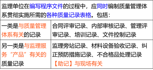 答察解析: 监理单位在编写程序文件的过程中,应同时编制质量管理体系贯彻实施所需的各种质量记录表格。包括: