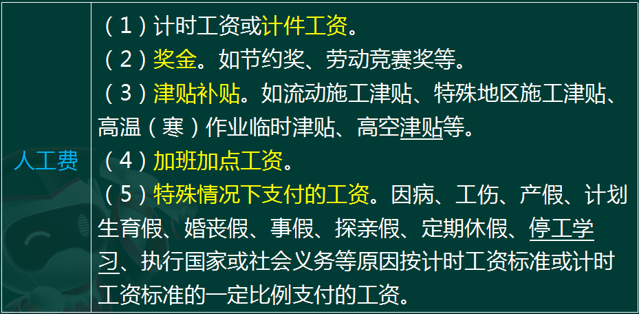 答察解析: 人工费包括:(1)计时工资或计件工资。(2)奖金。如节约奖、劳动竞赛奖等。(3)津贴补贴。如流动施工津贴、特殊地区施工津贴、高温(寒)作业临时津贴、高空津贴等。(4)加班加点工资。(5)特殊情况下支付的工资。因病、工伤、产假、计划生育假、婚丧假、事假、探亲假、定期休假、停工学习、执行国家或社会义务等原因按计时工资标准或计时工资标准的一定比例支付的工资。