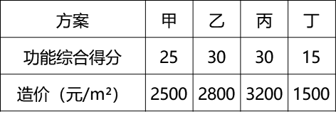 答察解析: 功能得分总和=25+30+30+15=100,造价总数=2500+2800+3200+1500=10000