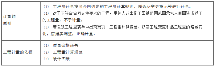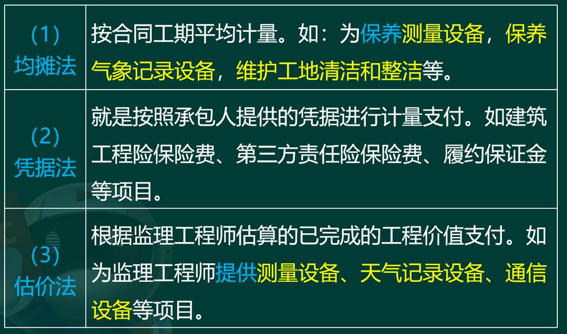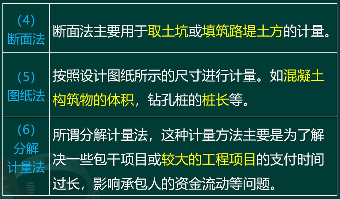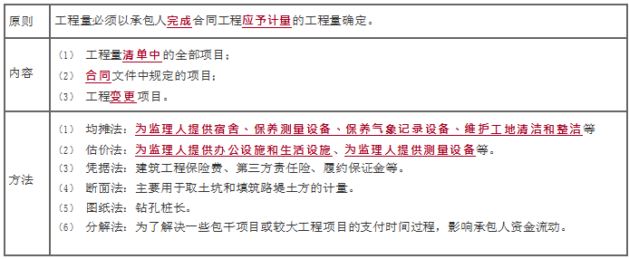 (1)均摊法:保养测量设备、保养气象记录设备、维护工地清洁和整洁等 (2)估价法:为监理人提供测量设施、为监理人提供天气记录设备、通信设备等。 (3)凭据法:建筑工程险保险费、第三方责任险保险费、履约保证金等。 (4)断面法:主要用于取土坑和填筑路堤土方的计量。 (5)图纸法:钻孔桩长。 (6)分解法:为了解决一些包干项目或较大工程项目的支付时间过长,影响承包人资金流动。 |