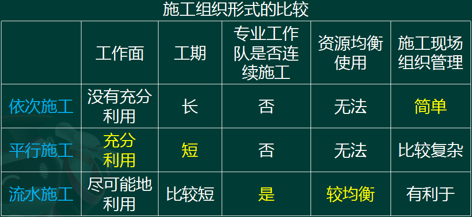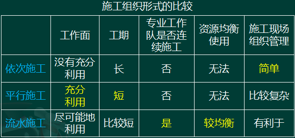 平行施工方式:如果由一个工作队完成一个施工对象的全部施工任务,则不能实现专业化施工,不利于提高劳动生产率。