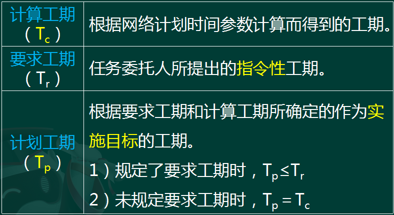 (3)计划工期。计划工期是指根据要求工期和计算工期所确定的作为实施目标的工期,用Tp表示。