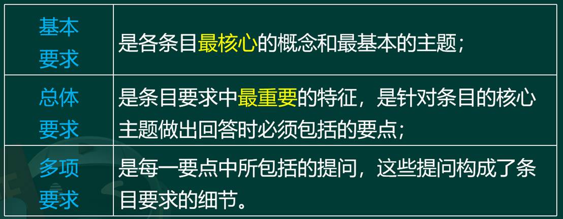 (二)总体要求是条目要求中最重要的特征,是针对条目的核心主题做出回答时必须包括的要点;