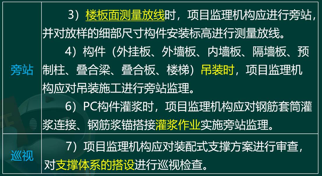 2)构件(外挂板、外墙板、内墙板、隔墙板、预制柱、叠合梁、叠合板、楼梯)吊装时,项目监理机构应对吊装施工进行旁站监理。