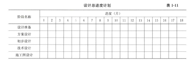 设计总进度计划主要用来安排自设计准备开始至施工图设计完成的总设计时间内所包含的各阶段工作的开始时间和完成时间,从而确保设计进度控制总目标的实现。该计划的表式见表1-11。