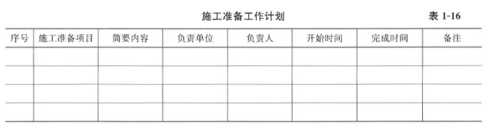 施工准备工作的主要任务是为建设工程的施工创造必要的技术和物资条件,统筹安排施工力量和施工现场。施工准备的工作内容通常包括:技术准备、物资准备、劳动组织准备、施工现场准备和施工场外准备。为落实各项施工准备工作,加强检查和监督,应根据各项施工准备工作的内容、时间和人员,编制施工准备工作计划。其表式见表 1-16。