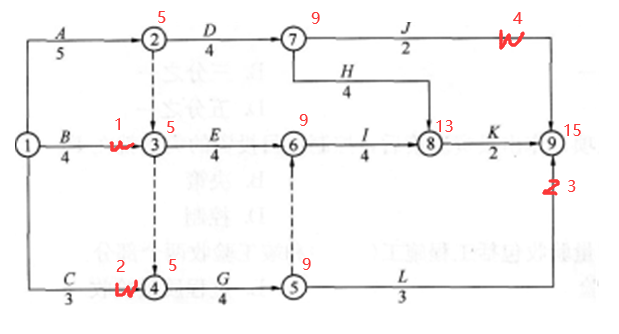 (4) 当计划工期等于计算工期时,关键节点的最早时间与最迟时间相等。