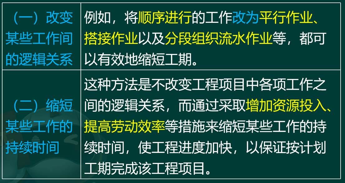 (二)缩短某些工作的持续时间:这种方法是不改变工程项目中各项工作之间的逻辑关系,而通过采取增加资源投入、提高劳动效率等措施来缩短某些工作的持续时间,使工程进度加快,以保证按计划工期完成该工程项目。