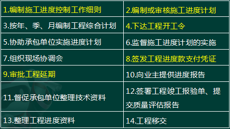 (1) 进度安排是否符合工程项目建设总进度计划中总目标和分目标的要求,是否符合施工合同中开工、竣工日期的规定。