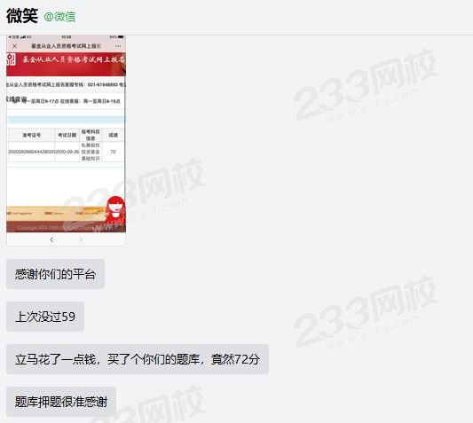 233网校学员们查分后也分享了通过233网校题库如何通过了基金从业资格考试,要重视章节题、错题、真题等题目。题目做的多,不如把把做过题目的知识点掌握牢固!