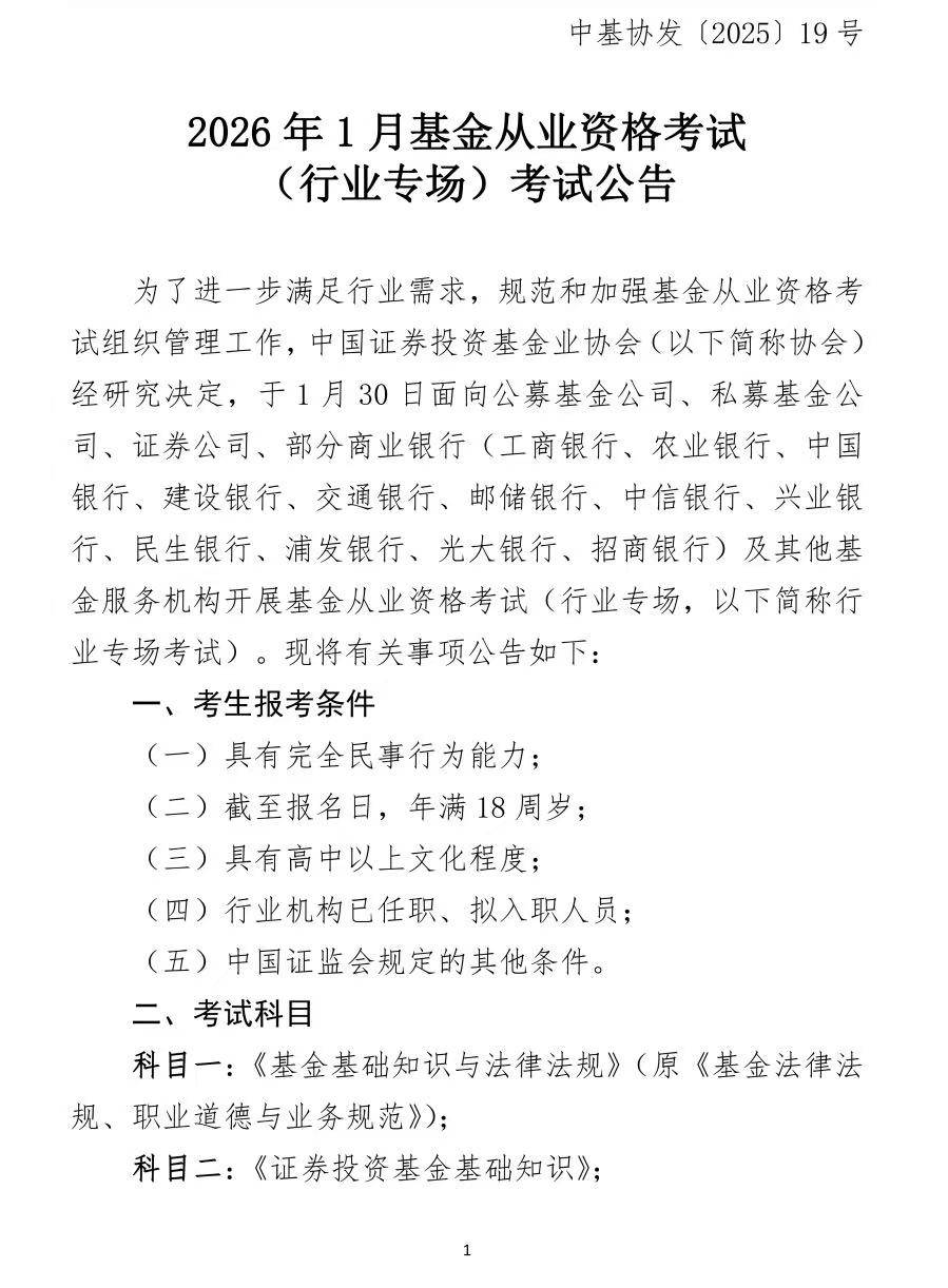 2026年1月基金从业行业专场考试什么时候报名?1月6日-19日。根据2026年1月基金从业考试通知,确定2026年1月30日举行基金行业专场考试,报名时间1月6日-1月19日,面向行业机构开展。具体大家可关注所在公司考试通知,以免错过考试。