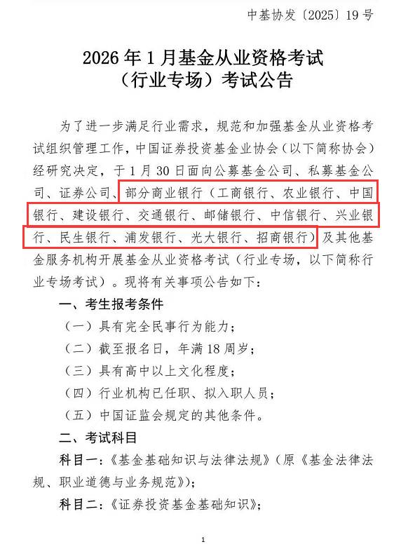 银行从业人员可以报名2026年1月基金从业考试吗?大部分可以。根据2026年1月基金行业专场考试通知,将于1月30日面向公募基金公司、私募基金公司、证券公司、部分商业银行(工商银行、农业银行、中国银行、建设银行、交通银行、邮储银行、中信银行、兴业银行、民生银行、浦发银行、光大银行、招商银行)及其他基金服务机构开展基金从业资格考试。具体大家可以关注所在公司考务通知,以免错过考试。非从业人员、在校大学生符合报名条件的情况下可以报名基金从业全国统一考试。