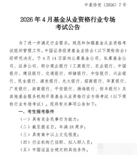 刚刚收到消息,2026年4月基金从业资格行业专场考试确定于4月14日举行,报名时间3月18日-3月31日,面向行业机构开展。大家可以关注公司报名通知(部分公司可报名,详见下文)。公告内容如下:(以下为考生反馈,仅供参考,具体以官方通知为准)