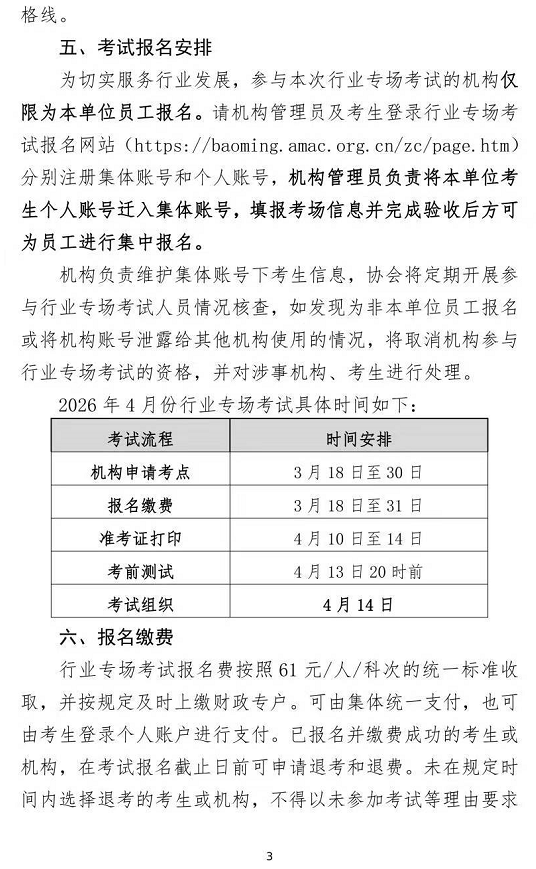 2026年4月基金从业资格行业专场考试时间确定为4月14日。本次考试面向行业机构从业人员报考,无法报名的考生可关注5月23日基金从业资格全国统考,统考面向社会考生报考,即非从业人员、在校大学生符合报名条件的话也可以报考。