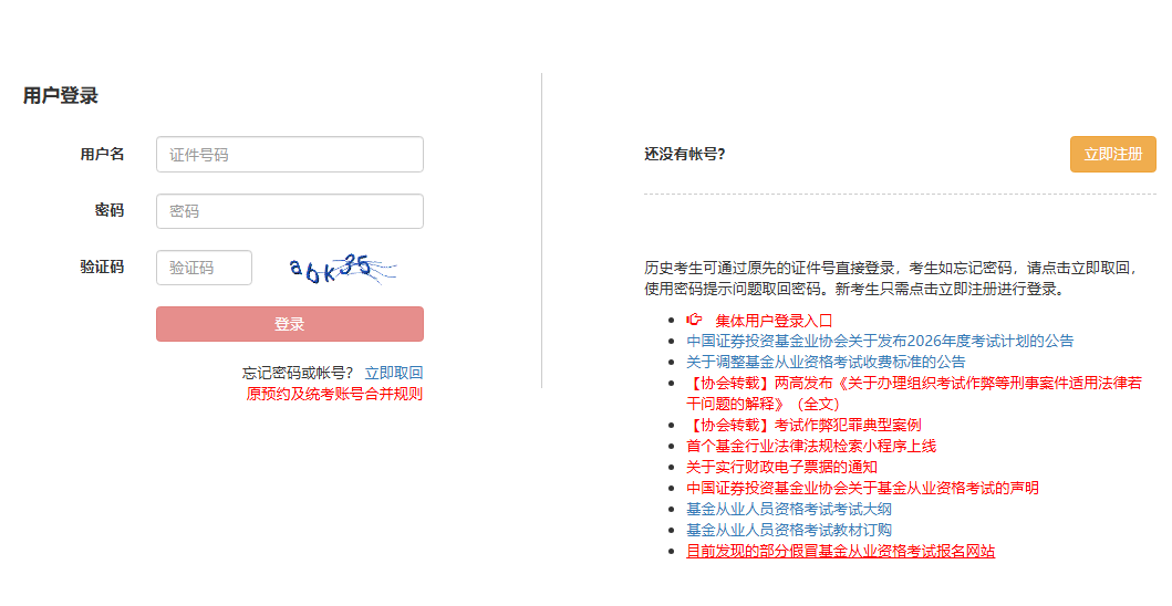第一步:登录中国证券投资基金业协会官网,进入网上报名系统。中国证券投资基金业协会首页-业务服务-从业人员管理-从业考试-个人登录。