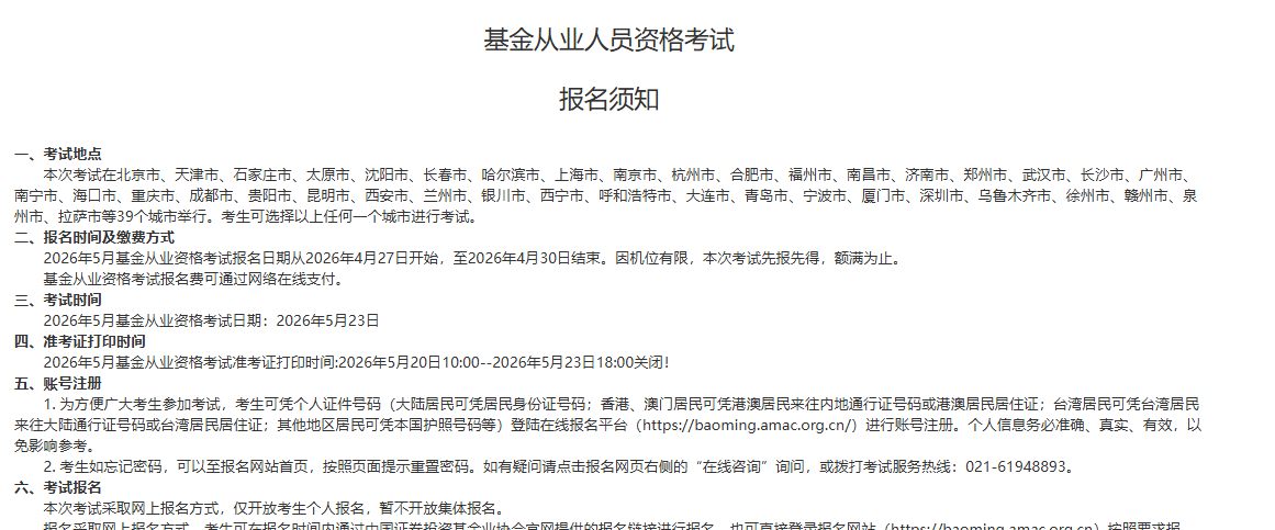同学们,2026年5月基金从业资格考试报名入口今日开通啦!本次报名时间为4月27日-4月30日,在校大学生、非从业人员符合报名条件的均可报名。考生可登录中国证券投资基金业协会官网右侧 “个人业务”--“从业考试”处进入报名入口。