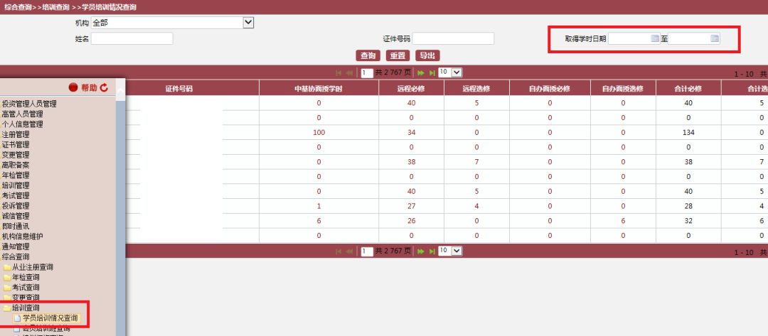 已在系统中注册的人员,均可查询后续培训情况(注意:右上角选择培训期间):综合查询——〉培训查询——〉学员培训情况查询。