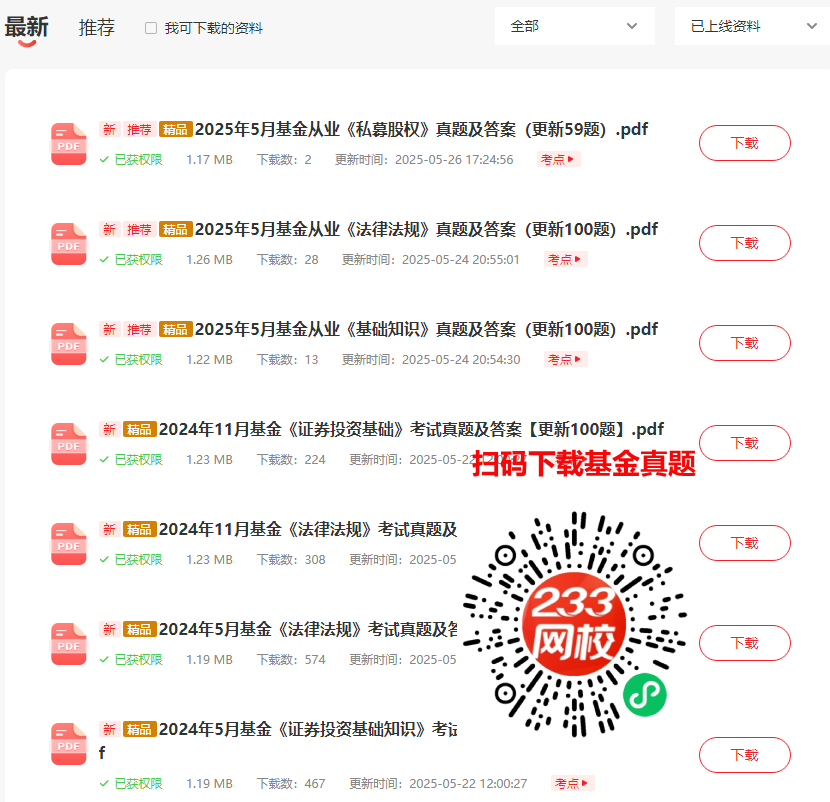 考试结束后,233网校将收集整理2025年基金从业考试真题下载版,届时大家也可以进入“233网校”APP--“我的资料包”进行下载打印基金考试真题答案PDF版。