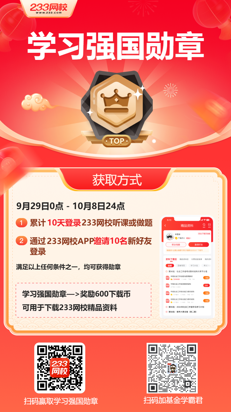 这个国庆,与其在备考路上 “单打独斗”,不如趁福利在手,把优质资料 “打包” 带回家 —— 用假期的碎片时间吃透真题、梳理考点,让每一分钟都花在刀刃上。别让时间悄悄熘走,点亮学习强国勋章,即可领取600资料下载币,开启高效备考模式,离你的基金从业考试目标再近一步!