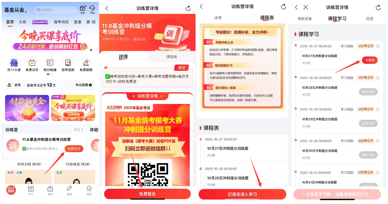 step1:进入233网校APP(可直接下图扫码下载233网校APP)--选择“基金从业”--选择“训练营”--点击“免费报名”。