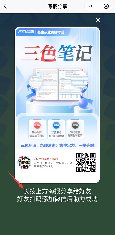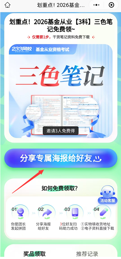 第四步:朋友识别“专属海报”上的二维码,添加基金学霸君,集满3个好友(新用户)添加即可【可通过活动页面,下滑至“推荐记录”查看助力进度。注意,删除就会失效哦】。