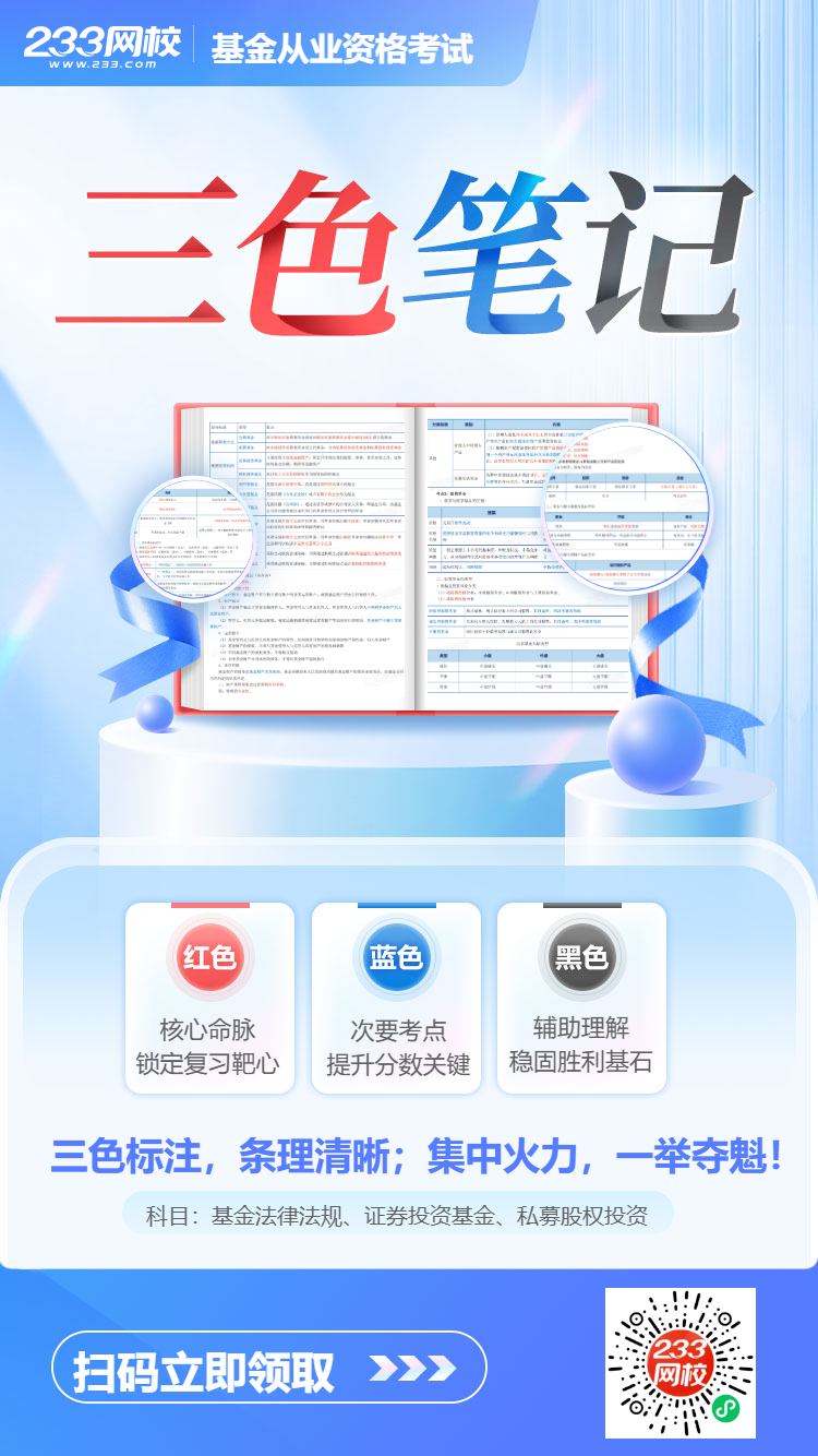 2026年基金从业资格考试越来越近了,你还在苦苦啃教材?还在纠结哪些是重点?还在困惑如何快速记忆?拒绝无效备战,三色笔记赶紧用起来!本系列资料由233网校教研老师根据2025年新发布的教材大纲精心整理,希望通过红、蓝、黑三种简单的色彩划分,帮助大家解决“找重点难、记不牢、理不清”的痛苦,从而高效备战,一举拿下基金从业资格证!