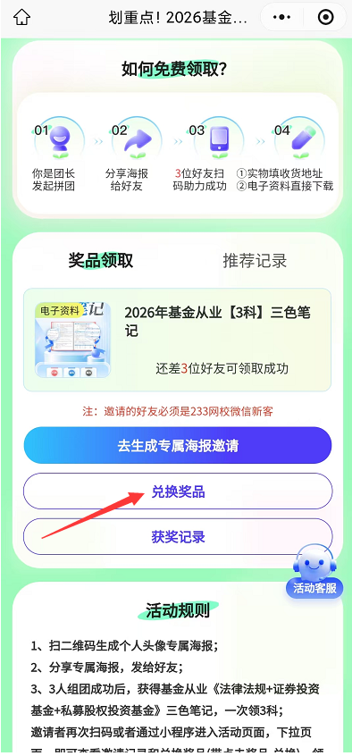 第五步:点击“兑换奖品”,即可立即获得基金从业3科三色笔记PDF资料。