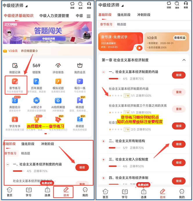 基础阶段,可依托章节练习打牢根基,习题细分至每节对应考点,还标注星级区分重要程度——一星级考点了解即可,二星级需理解掌握,三星级则要求灵活运用,帮助考生快速锁定核心考点,配合课程同步巩固知识,避免盲目刷题。