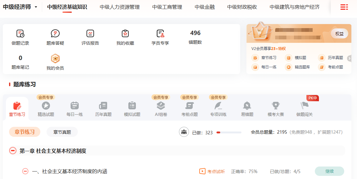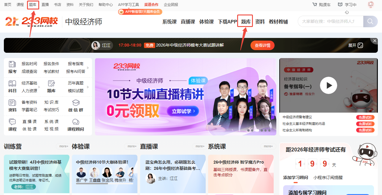 比如在中级经济师首页,页面中这些有题库两个字的地方,点击都可以直达233网校题库,其他的页面也是如此。