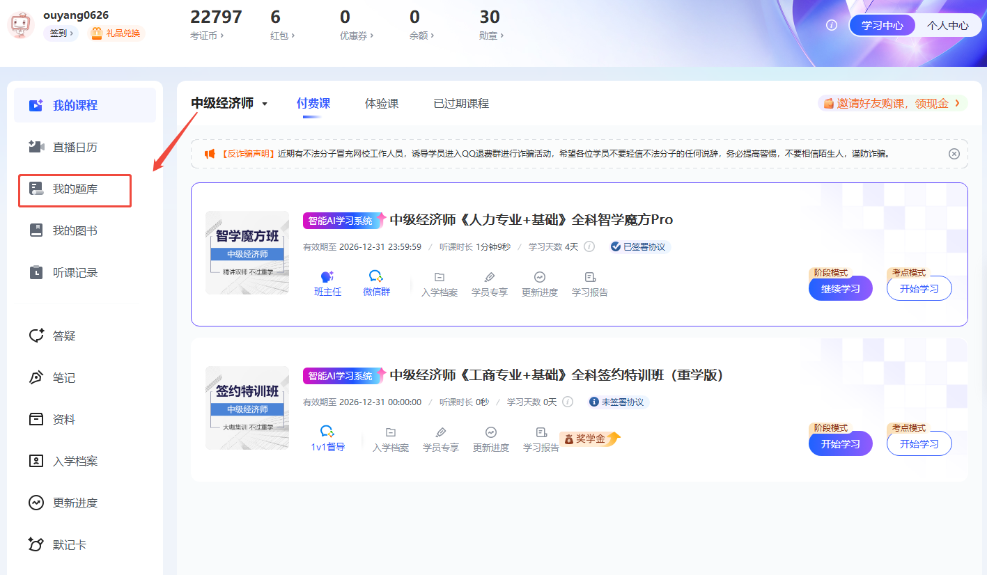 在学习中心左侧,有一个【我的题库】,如下图所示位置: