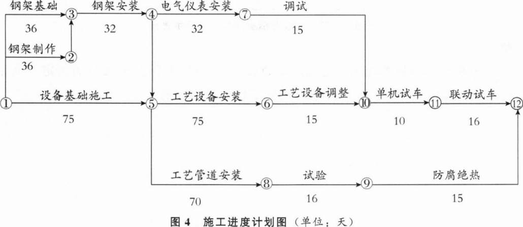 建设单位通过招标与施工单位签订了某工业项目的施工合同,主要工作内容包括设备基础、钢架基础、设备钢架、工艺设备、工艺管道、电气和仪表设备安装等。开工前,施工单位按照合同约定向建设单位提交了施工进度计划,如图4所示。