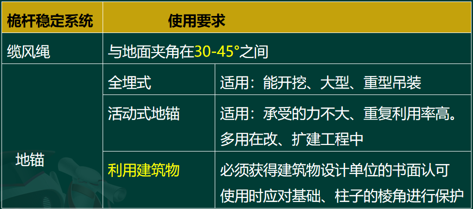 (3)D利用已有建筑物作为地锚。在利用已有建筑物前,必须获得建筑物设计单位的书面认可。使用时应对基础、柱子的棱角进行保护。
