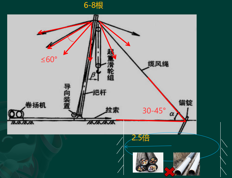 B选项错误,②缆风绳与地面的夹角宜为30°,最大不得超过45°。