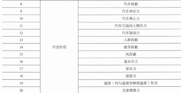 永久作用:结构重力(包括结构附加重力);预加力;土的重力;土侧压力;混凝土收缩、徐变作用;水的浮力;基础变位作用。